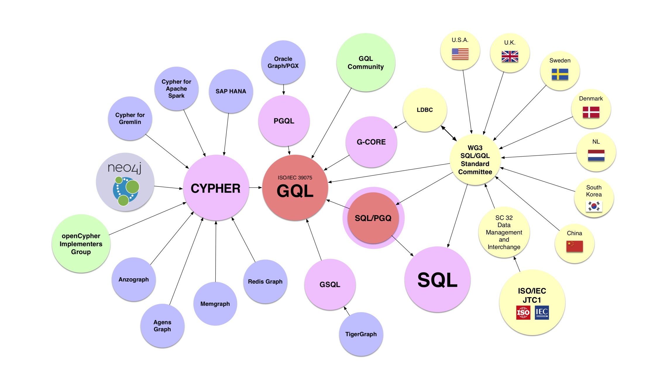 It’s well over thirty years since the SQL project started, initially as an ANSI standard: GQL is the first ISO/IEC international standard database languages project after SQL. Ten countries voted for the new project: China, Korea, Sweden, the U.S., Germany, the U.K., the Netherlands, Denmark, Kazakhstan, Canada and Finland. Five abstained on grounds of lack of expertise to judge or comment on the proposal. The diagram below shows the countries who have not only voted “Yes”, but also pledged expert participation.