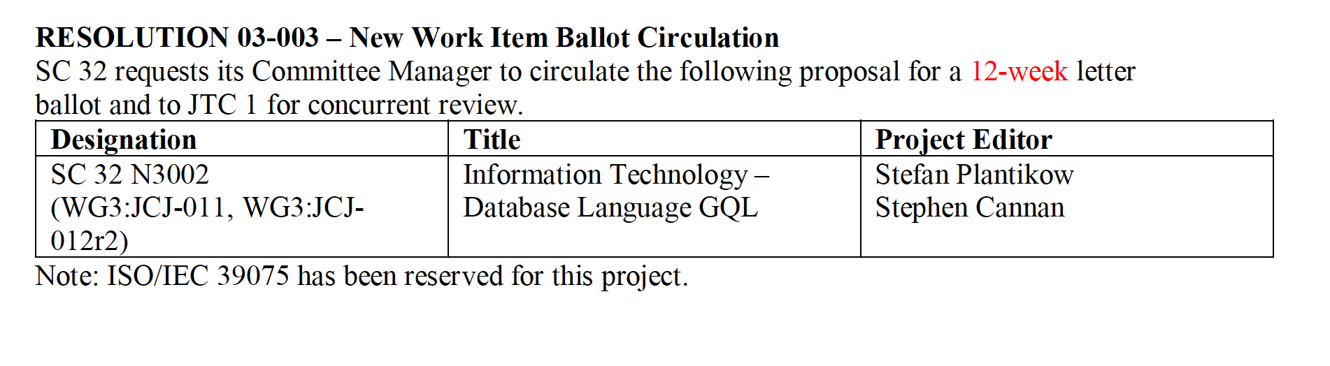The proposal before JTC 1 states that the ISO technical working group that runs the SQL standard, SC 32/WG3, will also be the home for work on GQL. Stefan Plantikow of Neo4j and Stephen Cannan, the SQL Technical Corrigenda editor, are proposed as the editors of the new standard. If you’d like to know more about WG3’s work please contact the Convenor, Keith Hare.